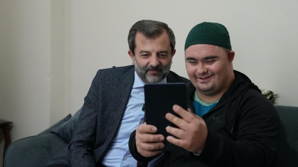 Başkan Işık’ı karşısında gören Yıldırım, sevince boğulurken, ilk işi, tableti açıp fotoğraf çekip ekrana koymak oldu.