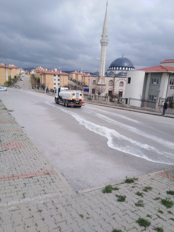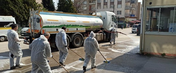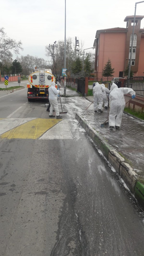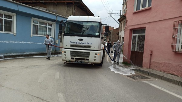 Gürsu Belediyesi corona virüs salgınıyla mücadele kapsamında sokakları dezenfekte ediyor.