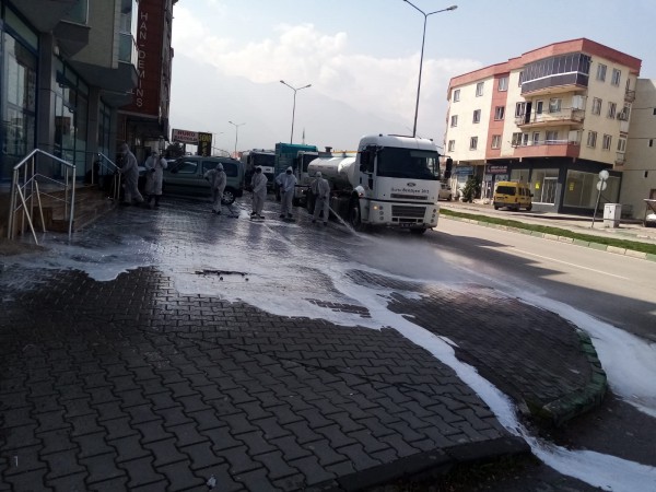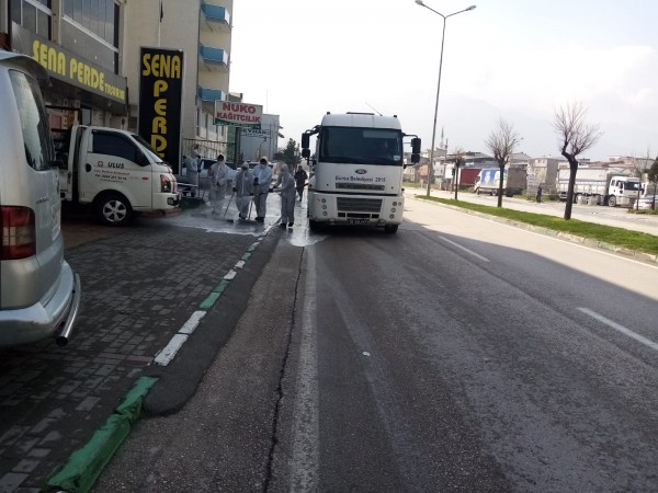 Gürsu Belediyesi Temizlik İşleri Müdürlüğü bünyesinde oluşturulan ekipler, Gürsu‘da corona virüsten korunma tedbirleri kapsamında, ana arterleri dezenfekte ediyor.