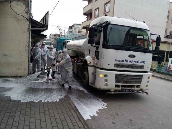 Gürsu Belediyesi corona virüs salgınıyla mücadele kapsamında sokakları dezenfekte ediyor. Gürsu Belediyesi Temizlik İşleri Müdürlüğü bünyesinde oluşturulan ekipler, Gürsu‘da corona virüsten korunma tedbirleri kapsamında, ana arterleri dezenfekte ediyor. Gürsu Belediye Başkanı Mustafa Işık, “Corona virüs salgınına karşı aldığımız korunma tedbirlerimiz kapsamında caddelerimizi dezenfekte çalışmalarımız devam ediyor. Hepimizin sokaklarımızda sağlıkla dolaşabileceği günlerin en kısa za