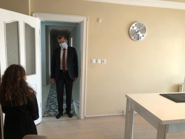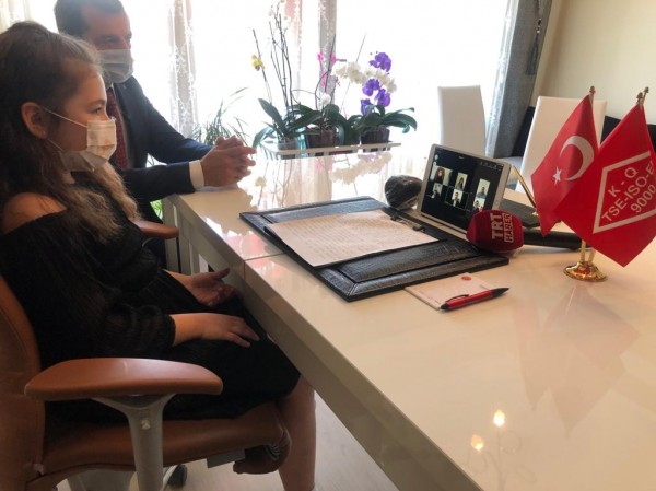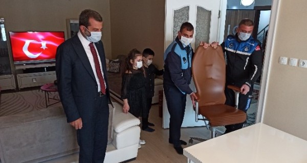 Korona virüs salgını nedeniyle getirilen kurallar kapsamında evden çıkamayan 8 yaşındaki İrem Yörümez, kendi evine taşınan başkanlık koltuğuna oturdu.