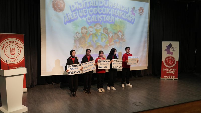 Dünya Çocuk Hakları Günü’nde Gürsu’da, çağın gereksinimlerine yerinde cevaplar arayan, anlamlı bir çalıştay düzenlendi. Gürsu Belediyesi Kadın ve Aile Hizmetleri Müdürlüğü tarafından düzenlenen Dijital Dünyada Aile ve Çocuk Hakları Çalıştayı yoğun bir katılımla gerçekleştirildi. Açılış konuşmaları ile başlayan çalıştayda, çocuklar tarafından haklarına dikkat çekilen anlamlı bir gösteri de düzenlendi. Çalıştaya, uzmanların yanı sıra Aile ve Sosyal Politikalar İl Müdürlüğü’nden yetkilil