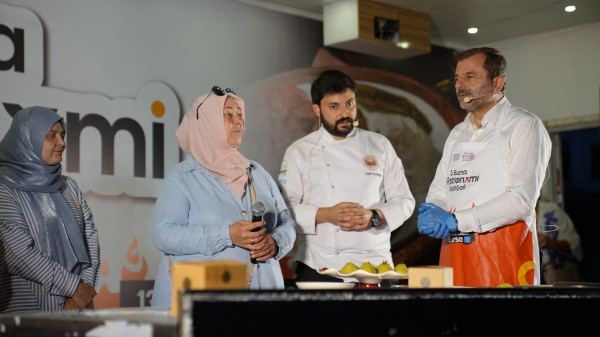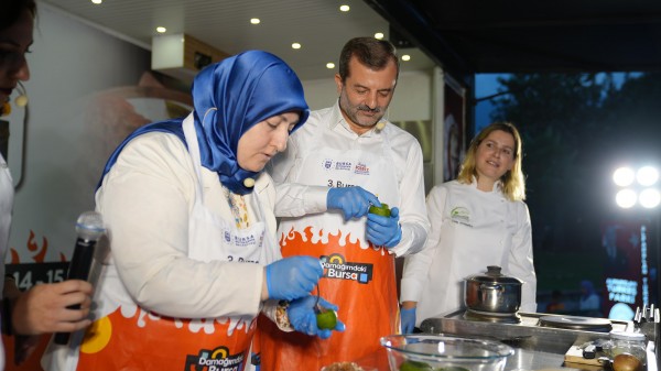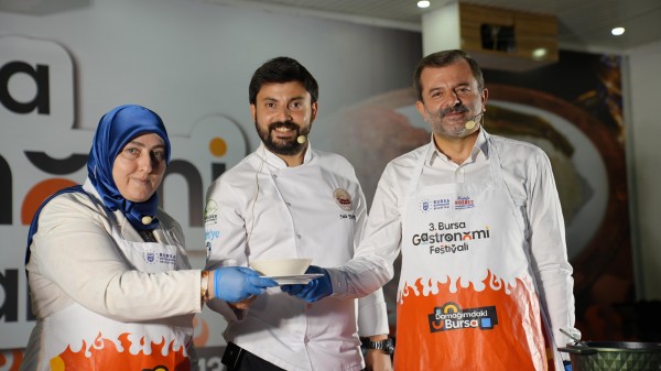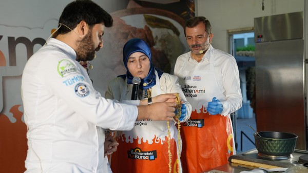 Bursa’nın lezzetlerini ilçelerle buluşturmak ve Bursalıları festivale davet etmek amacıyla Büyükşehir Belediyesi tarafından ilçelerde gezdirilen Gastronomi Tırı’nın yeni durağı Gürsu oldu. Belediye Başkanı Mustafa Işık ve Eşi Sümeyye Işık tarafından sahnede özel bir mutfakta hazırlanan menü ile Gürsu’nun lezzetleri tanıtıldı. Akademisyen Şef Fatih Yıldırım, Bursa Aşçılar Derneği Kadın Kolları Başkanı Tülay Dönmez, Eğitmen Şef Selin Sekizkardeşler ve Eğitmen Şef Aybiçe Taylak’ın yardımları ile anlatılan menüde Gürsu bamyasından bamya çorbası, hinkal ve armutlu kurabiye yapıldı.