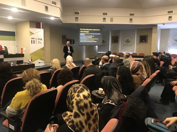 Kimliği belirli veya belirlenebilir gerçek kişiye ilişkin her türlü bilgi olarak tanımlanan kişisel verilerin korunmasının yasalar açısından tarihi gelişimini anlatan Eralp, kişisel verilerin işlenmesi, veri sorumluluğu ve yükümlülükler hakkında bilgiler verdi. Kişisel verilerin ilgili kişinin rızası olmadan işlenemeyeceğini vurgulayan Eralp, özel nitelikli kişisel verilerin işlenmesinde açık rıza gerektirmeyen haller konusunda da bilgiler sundu.