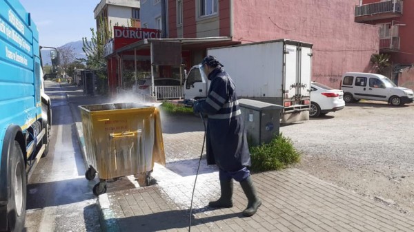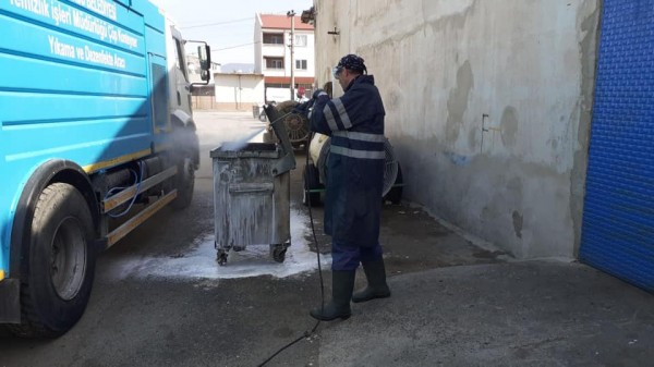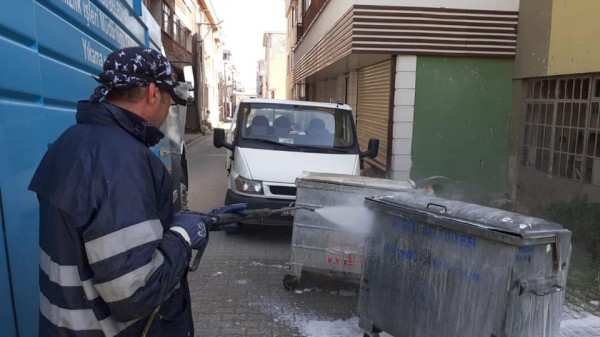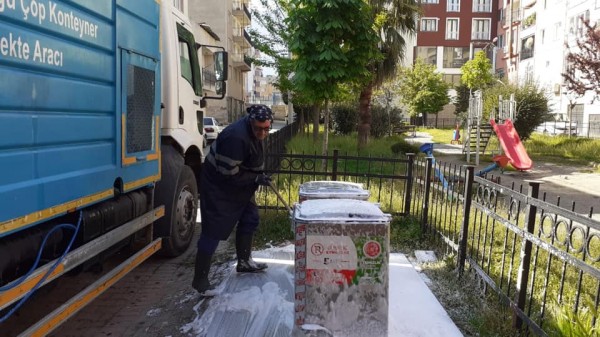 Konteyner dezenfekte çalışmaları kapsamında, tüm mahallelerde konteynerler tek tek temizlenip dezenfekte ediliyor.
