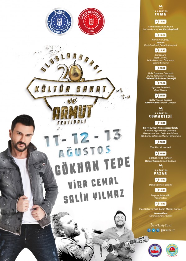10-13 Ağustos 2017 tarihleri arasında gerçekleştirilecek 20. Kültür, Sanat ve Armut Festivali, zengin program içeriğiyle Gürsulular’ın özlediği festival coşkusunu yaşatacak.