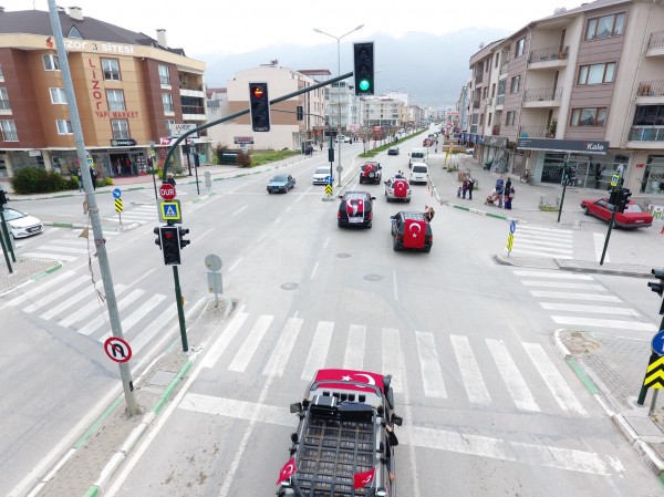 18 Mart çanakkale Zaferi’nin yıldönümü ve Afrin şehir merkezinin kontrol altına alınmasıdolayısıyla, Gürsu Belediyesi önünde bir araya gelen Bursa Offroad Kulübü üyeleri, Türk bayraklarının bulunduğu araçlarıyla ilçe merkezinde tur attı.