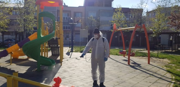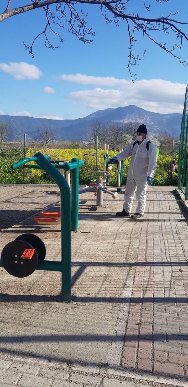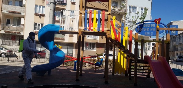 Gürsu Belediyesi Park ve Bahçeler Birimi tarafından yapılan dezenfekte çalışmaları kapsamında, parklardaki çocuk oyun grupları, banklar, spor aletleri, tabelalar corona virüse karşı ilaçlanıyor.