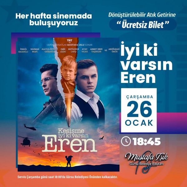 Gürsu Belediyesi, geri dönüştürülebilir atıkları getirerek sinema bileti alma hakkı kazanan Gürsulular’a, tüm Türkiye’nin içini acıtan ve kahramanlıklarıyla örnek olan şehitlerimiz Eren Bülbül ve Astsubay Kıdemli Başçavuş Ferhat Gedik’in hikayesini anlatan ‘’Kesişme: İyi ki Varsın Eren’’ filmini ücretsiz izleme olanağı sundu. Ulaşımın da Gürsu Belediyesi’nce sağlandığı etkinlikte, 300 kişi ücretsiz olarak filmi izleme imkanı buldu.