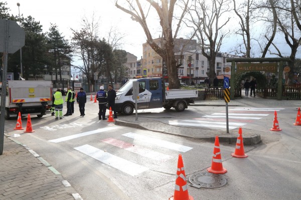 Gürsu Belediyesi Zabıta Müdürlüğü Trafik Birimi’nce yapılan çalışmalar kapsamında, okul önlerindeki yaya geçit çizgileri yenileniyor.