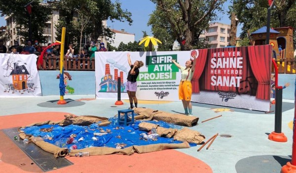 Etkinlikte, cam ve pet şişe, kağıt, pil gibi geri dönüşüm malzemelerini getirerek tiyatro bileti alan çocuklar, çöplerin dönüştürülmesiyle doğanın sıfır atık sistemiyle korunabileceği konusunda bilinç kazandı.