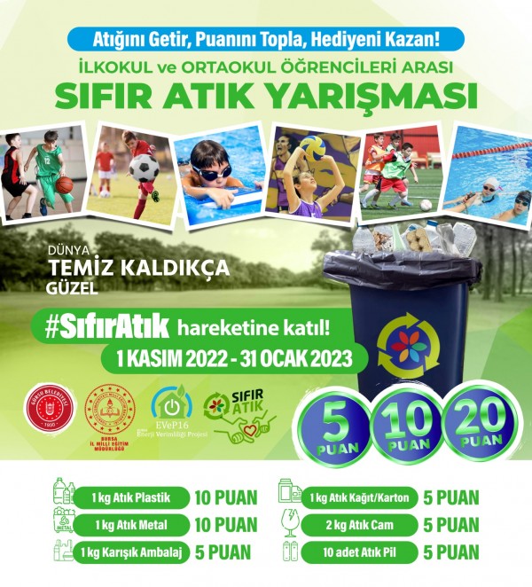 Gürsu Belediyesi’nin, “Dünya temiz kaldıkça güzel”, “Sıfır atık hareketine katıl” sloganlarıyla başlattığı geri dönüşüm hareketi kapsamında ayrıca; çocuklara yönelik, “Atığını getir, puanını topla, hediyeni kazan” sloganıyla, sıfır atık yarışması düzenleniyor. Kampanya tarihleri arasında toplanan atığın türüne ve miktarına göre kazanılan puanlar ile 100 puan toplayan öğrenci, Gürsu Belediyesi Kültür İşleri Müdürlüğü'nün düzenlediği futbol, basketbol, voleybol veya yüzme kurslarından herhangi birine, bir aylık ücretsiz katılım hediyesi kazanacak.