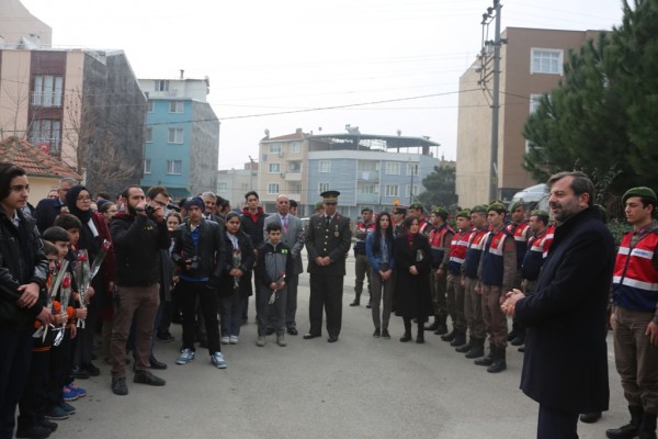 Törende askerler için Kuran’ı Kerim okunarak dua edildi. Bir öğrencinin askerlere yazdığı mektubu okumasının ardından çocuklar ellerinde bulunan çiçekleri Gürsu Jandarma Komutanlığı’nda görev yapan askerlere sundu.