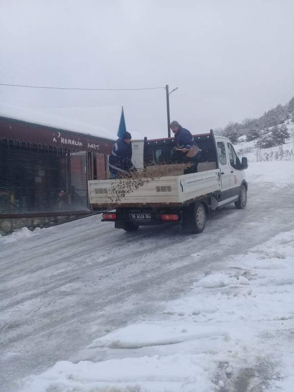 Gürsu Belediyesi Fen İşleri Müdürlüğü ekiplerince yapılan tuzlama çalışmalarıyla dağ yollarındaki kar yağışının ulaşımı engellemesi önleniyor.